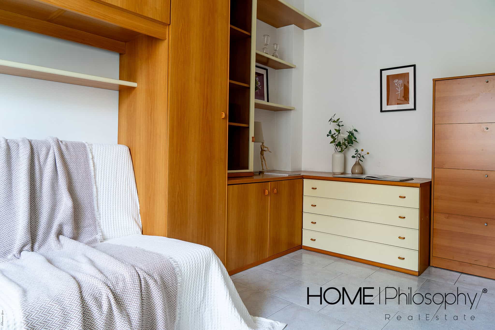 Situato al secondo piano di un contesto tranquillo, l’appartamento accoglie con un ingresso che introduce nella luminosa zona giorno/notte, dove ogni elemento d’arredo su misura è stato progettato per valorizzare lo spazio e renderlo armonioso.