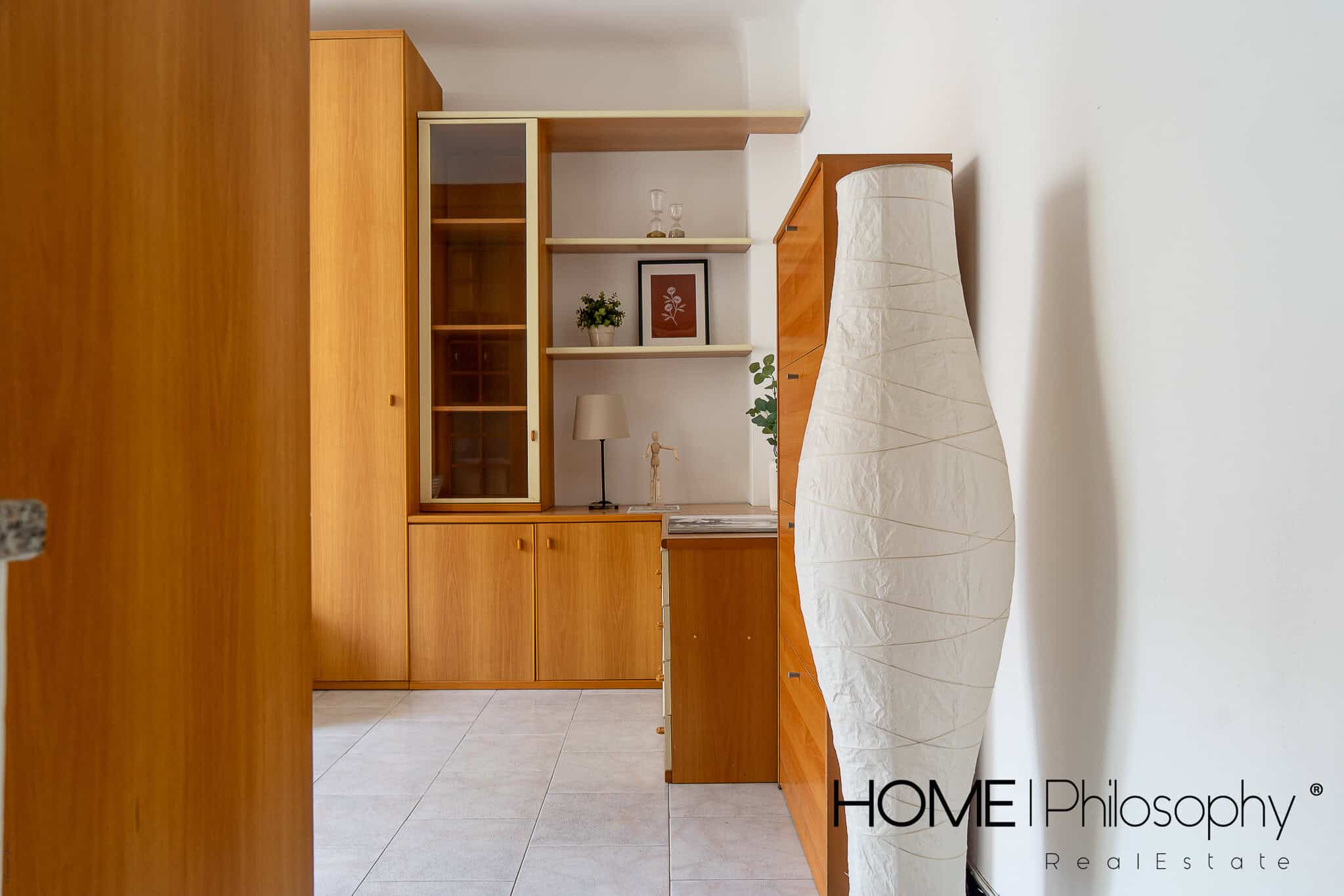 Situato al secondo piano di un contesto tranquillo, l’appartamento accoglie con un ingresso che introduce nella luminosa zona giorno/notte, dove ogni elemento d’arredo su misura è stato progettato per valorizzare lo spazio e renderlo armonioso.